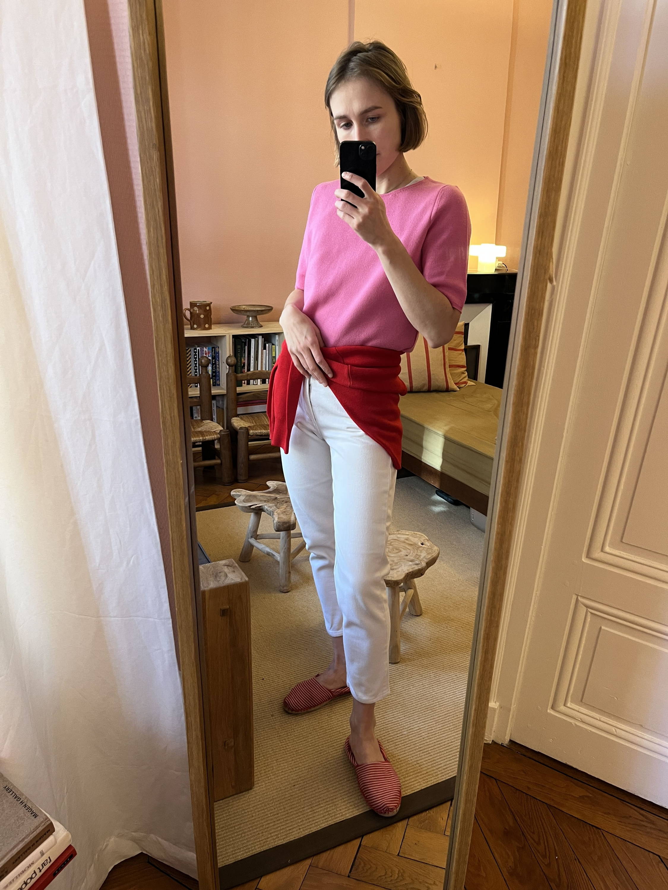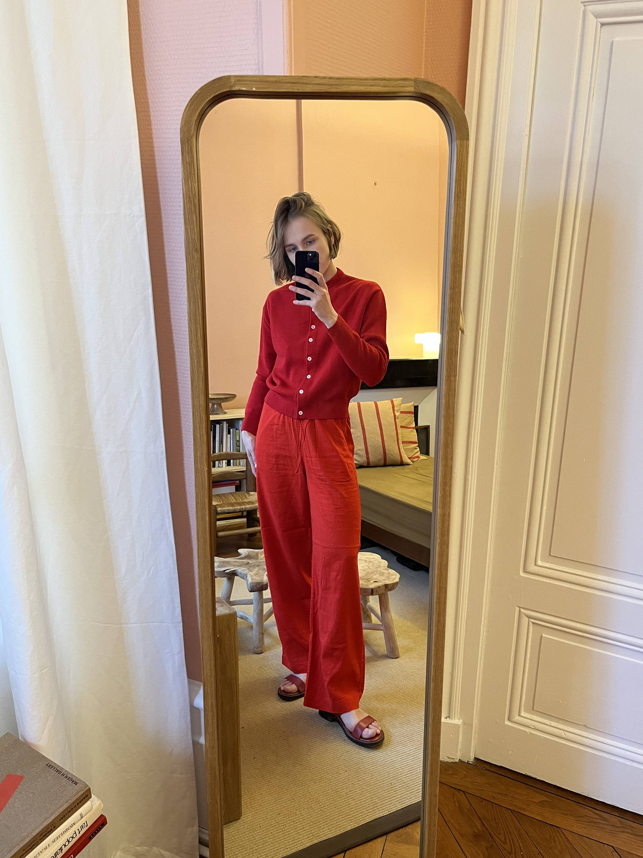 Habituée aux total looks blancs lorsque les températures grimpent, l’envie ici est justement de bousculer cette habitude. Le total rouge s’impose alors comme une évidence : pantalon rouge, Gilet Coquelicot, et même sandales assorties.