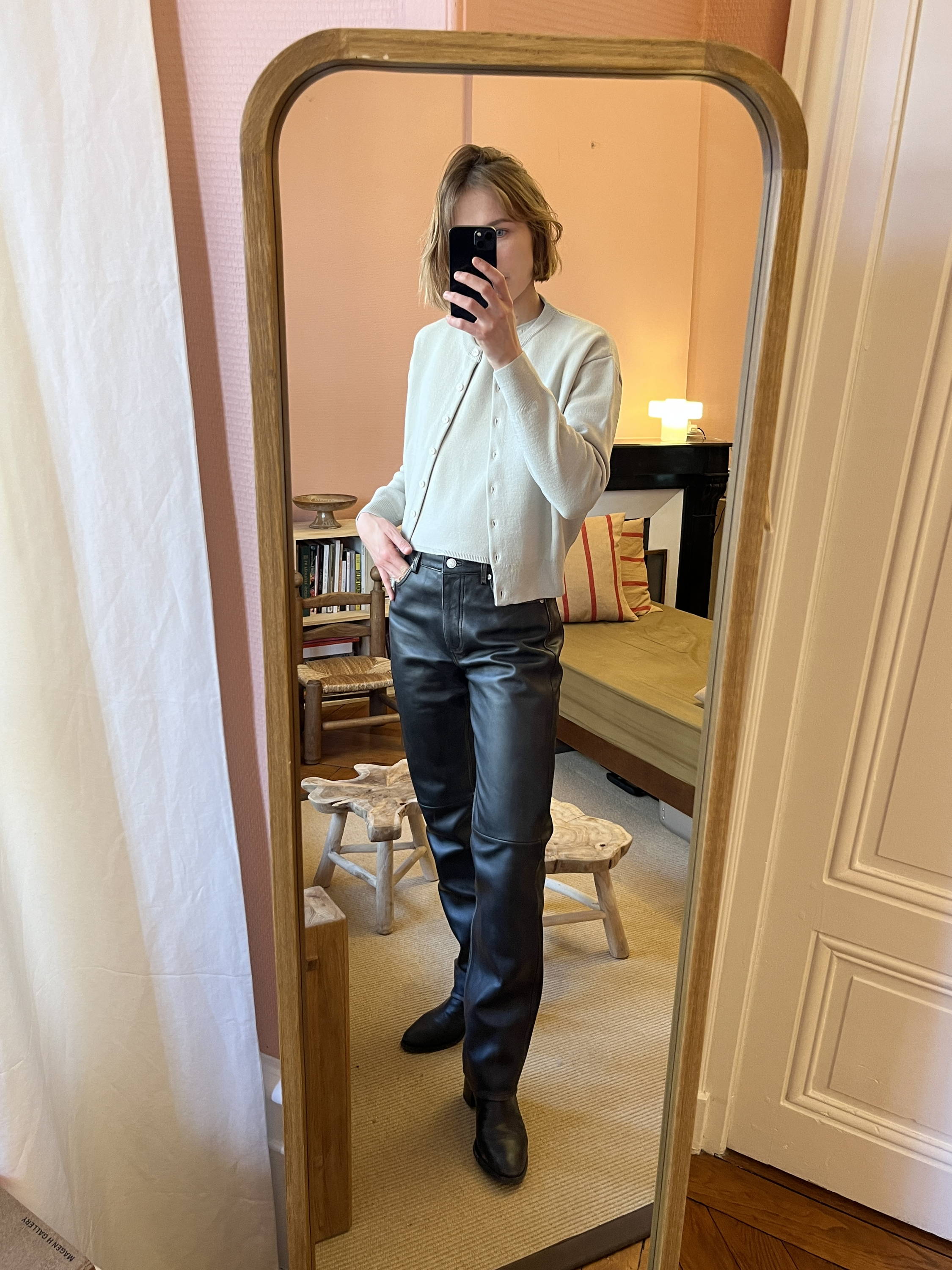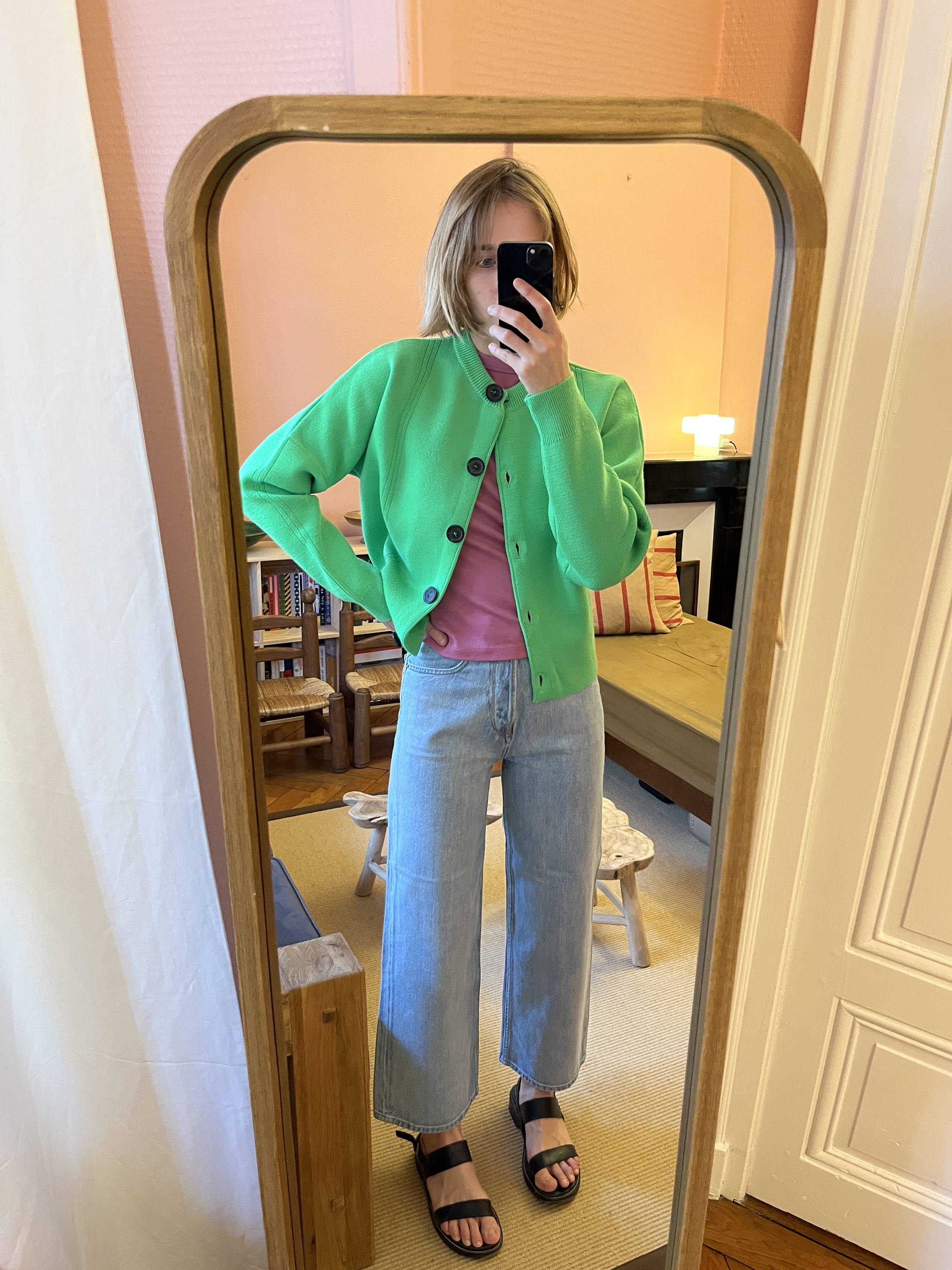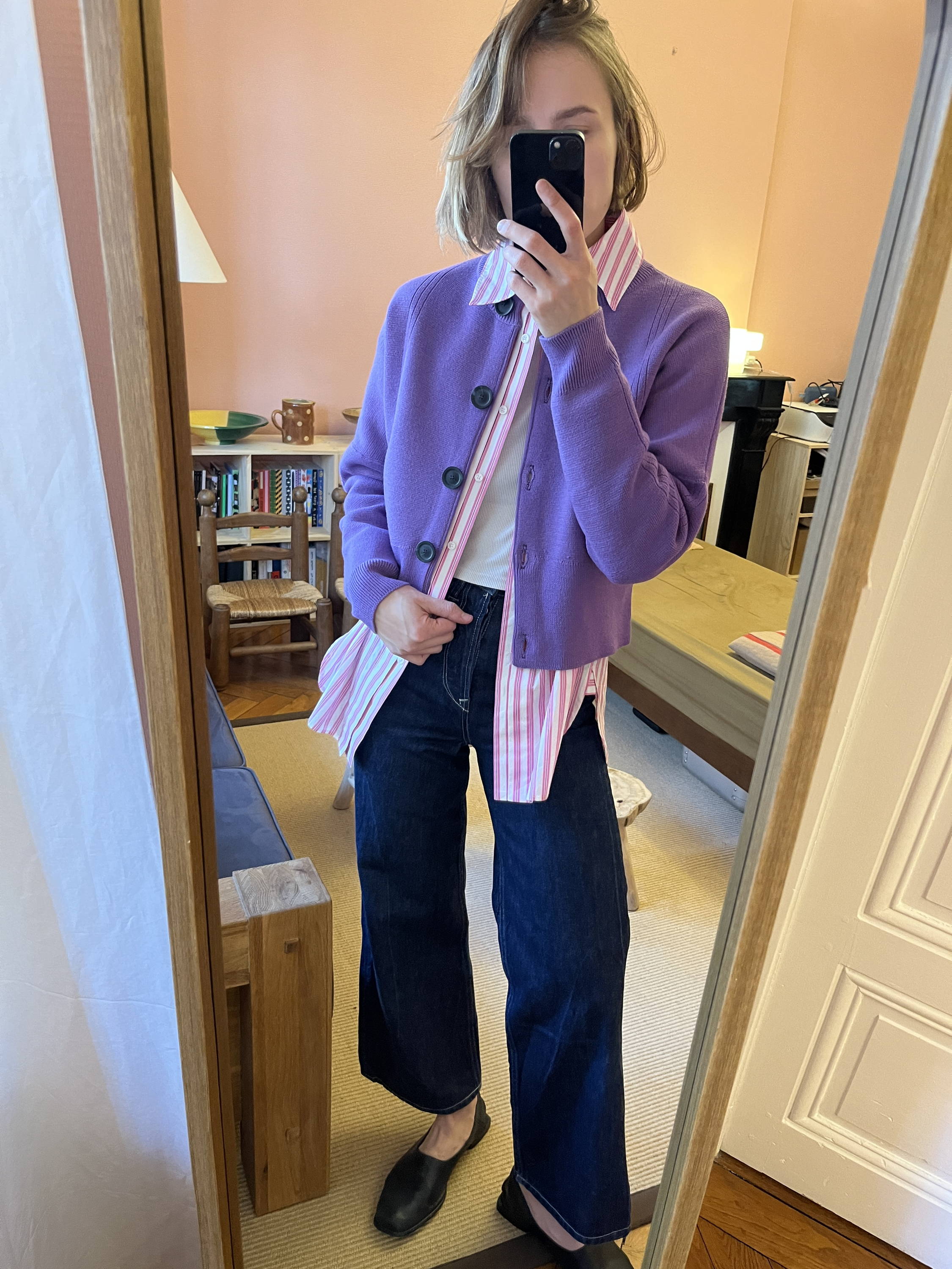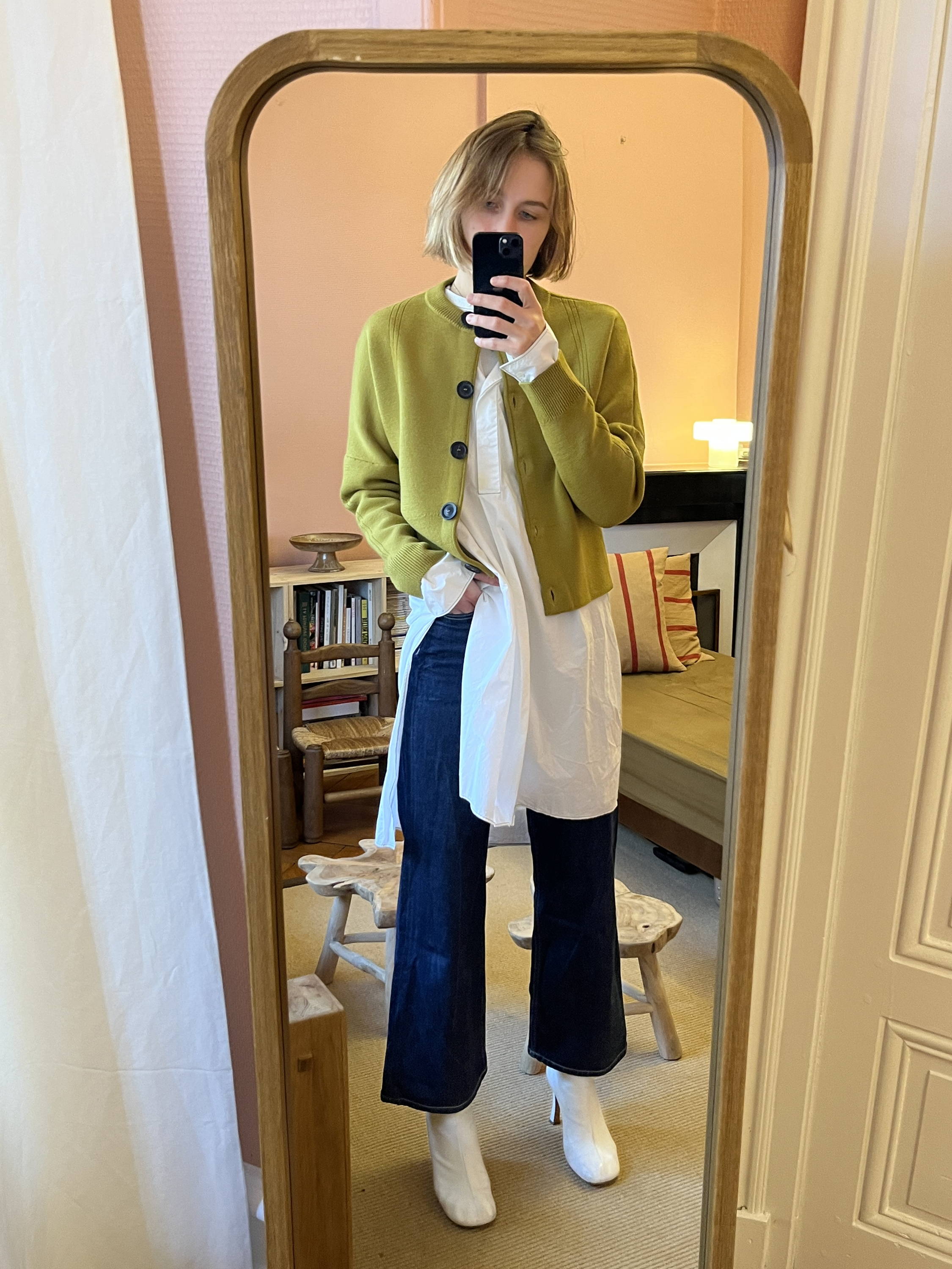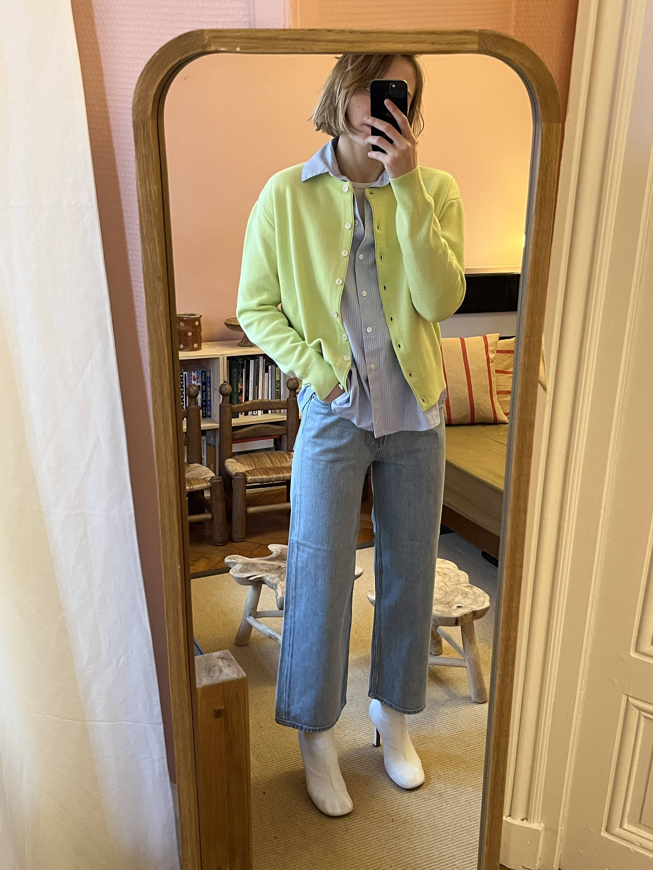 L’une de mes associations favorites consiste à superposer le cardigan sur une tunique longue, accompagné d’un jean large et de bottines à talons. Le volume de la chemise est ainsi contrebalancé, la jambe visuellement allongée, la silhouette rééquilibrée.