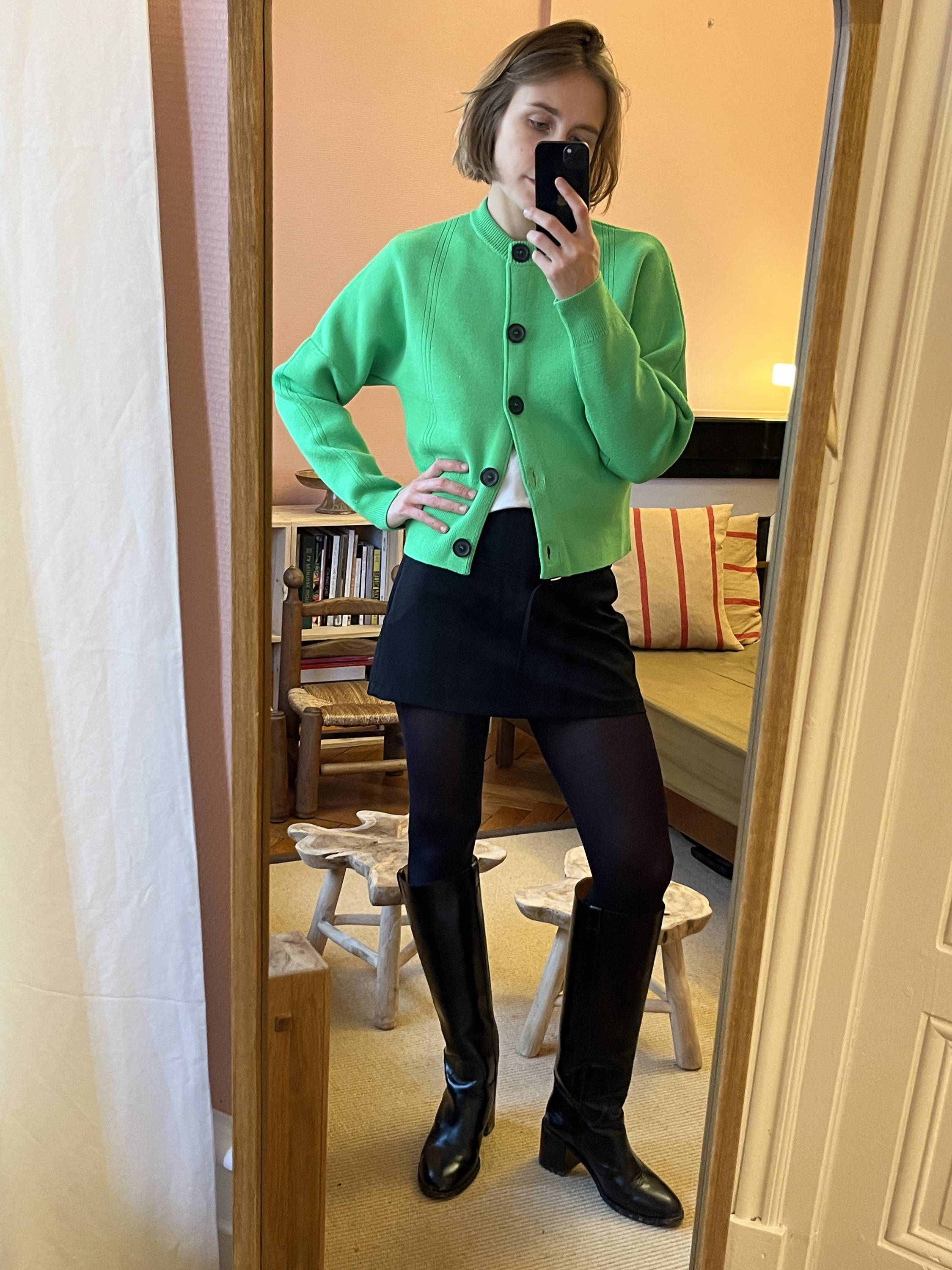 Porté sur un tee-shirt blanc, une mini-jupe noire, des collants noirs et des bottes noires, il vient électriser les silhouettes les plus classiques. Un manteau noir par-dessus, et le vert fluorescent s’impose comme un point d’éclat maîtrisé, capable de transformer instantanément l’allure.