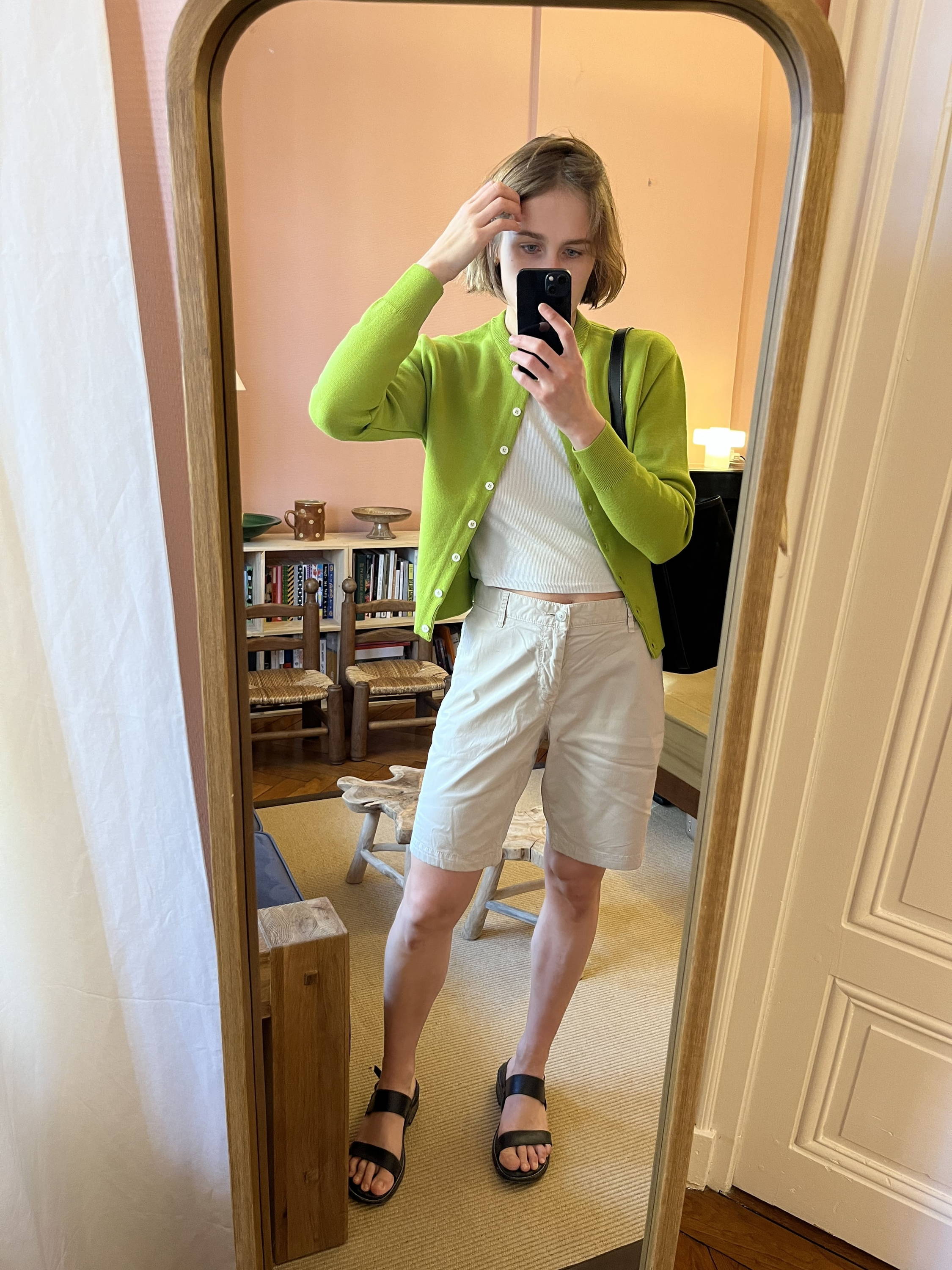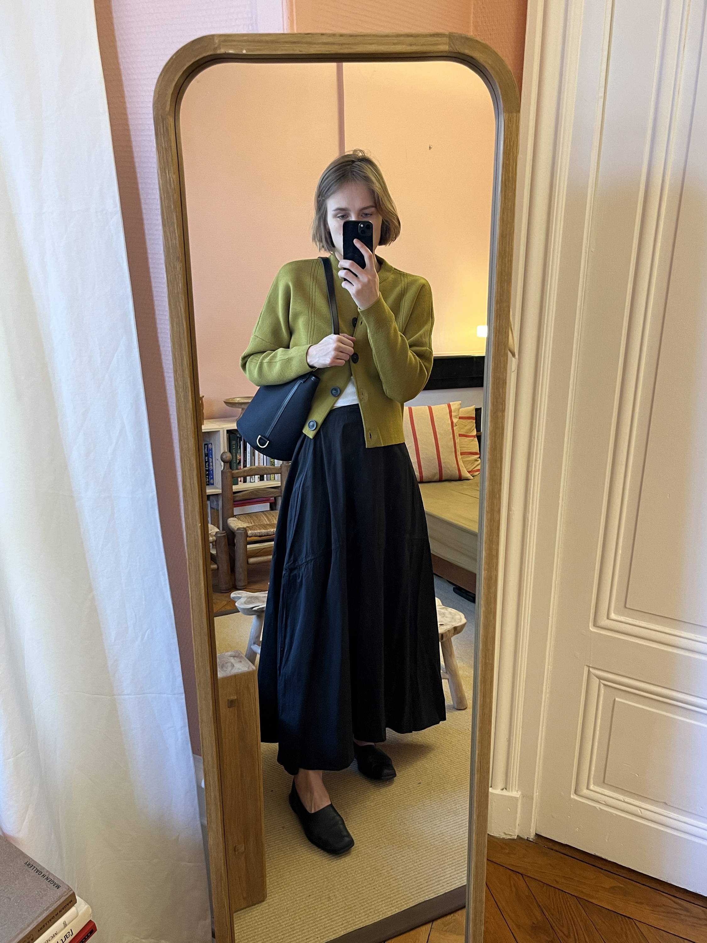 Dans une lecture plus épurée, le Cardigan Vert Ambre se porte sur un débardeur blanc, associé à une jupe noire longue et fluide, et des ballerines. Sac à l’épaule, le look idéal pour un dimanche de déambulation, entre confort et élégance naturelle.