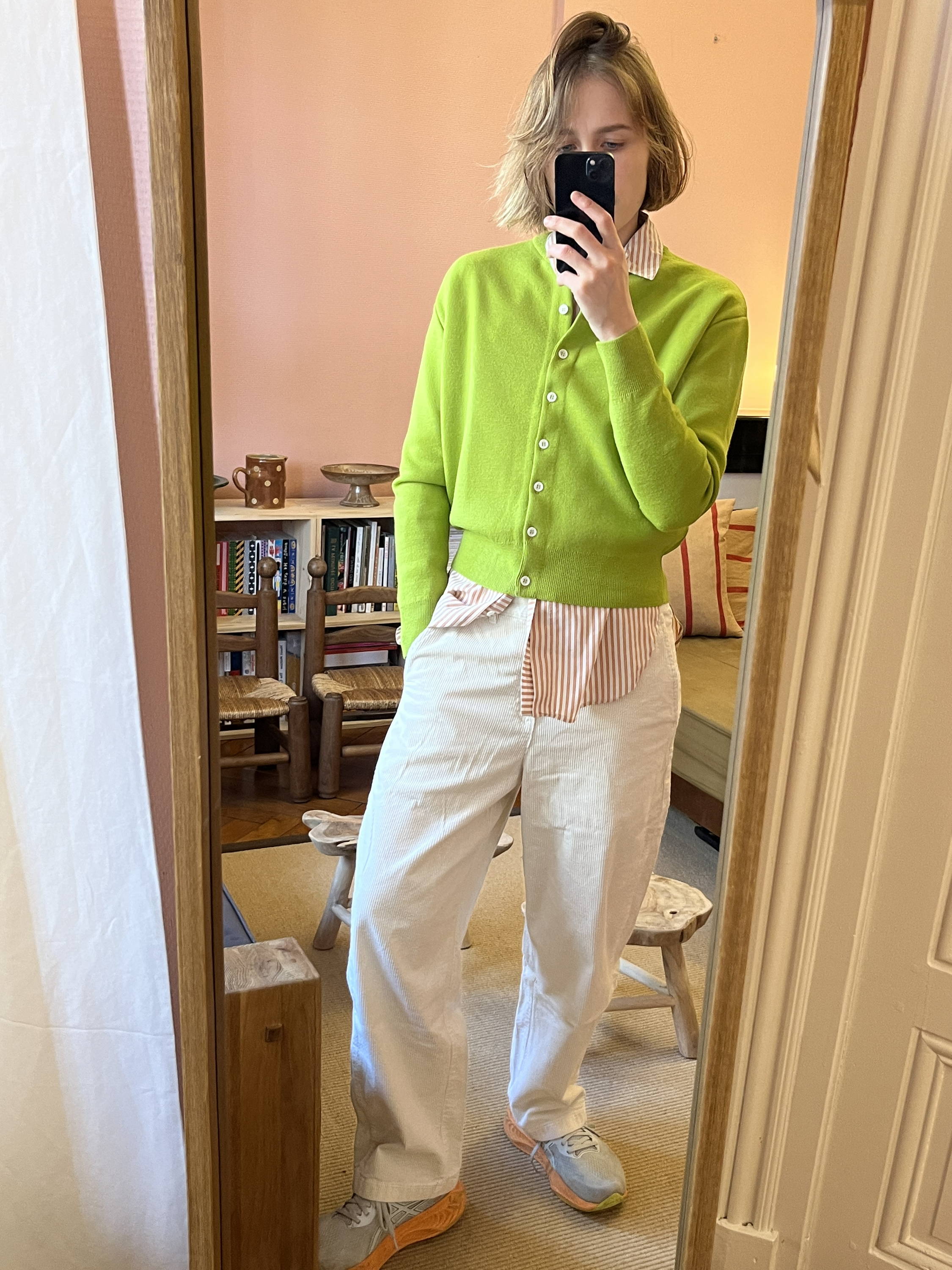 En été, il invite à oser la couleur. Après des années chez RÉUNI, entre shootings et échanges avec les stylistes photo, une certitude s’impose : il ne faut pas avoir peur des couleurs. Le Cardigan Vert Fluorescent dialogue à merveille avec le rose, le bleu, le jaune pâle ou encore le rouge.
